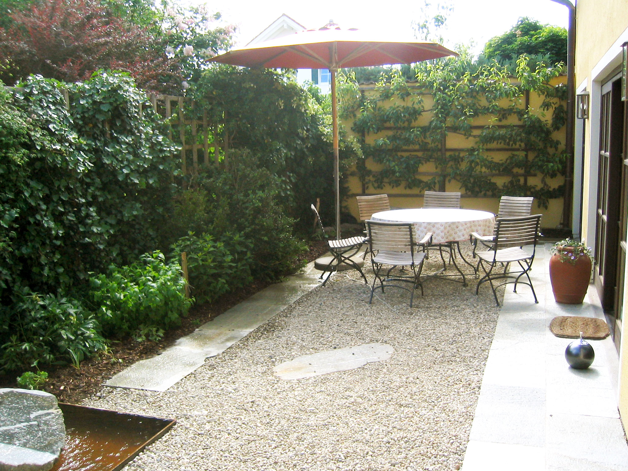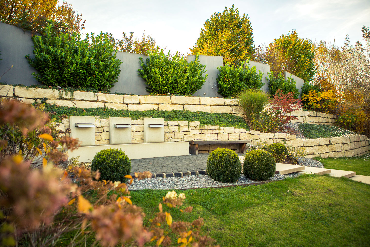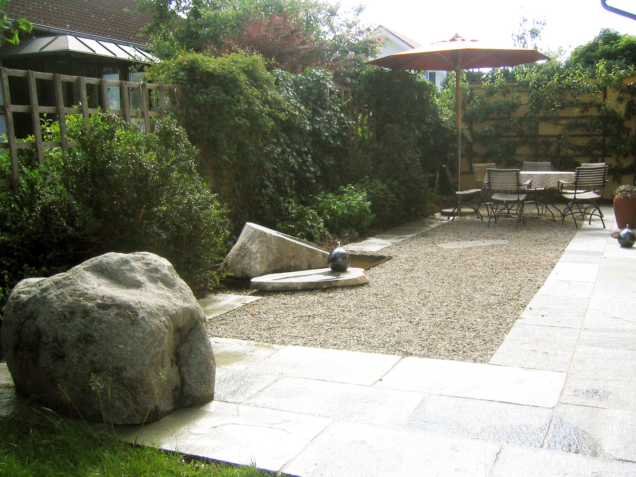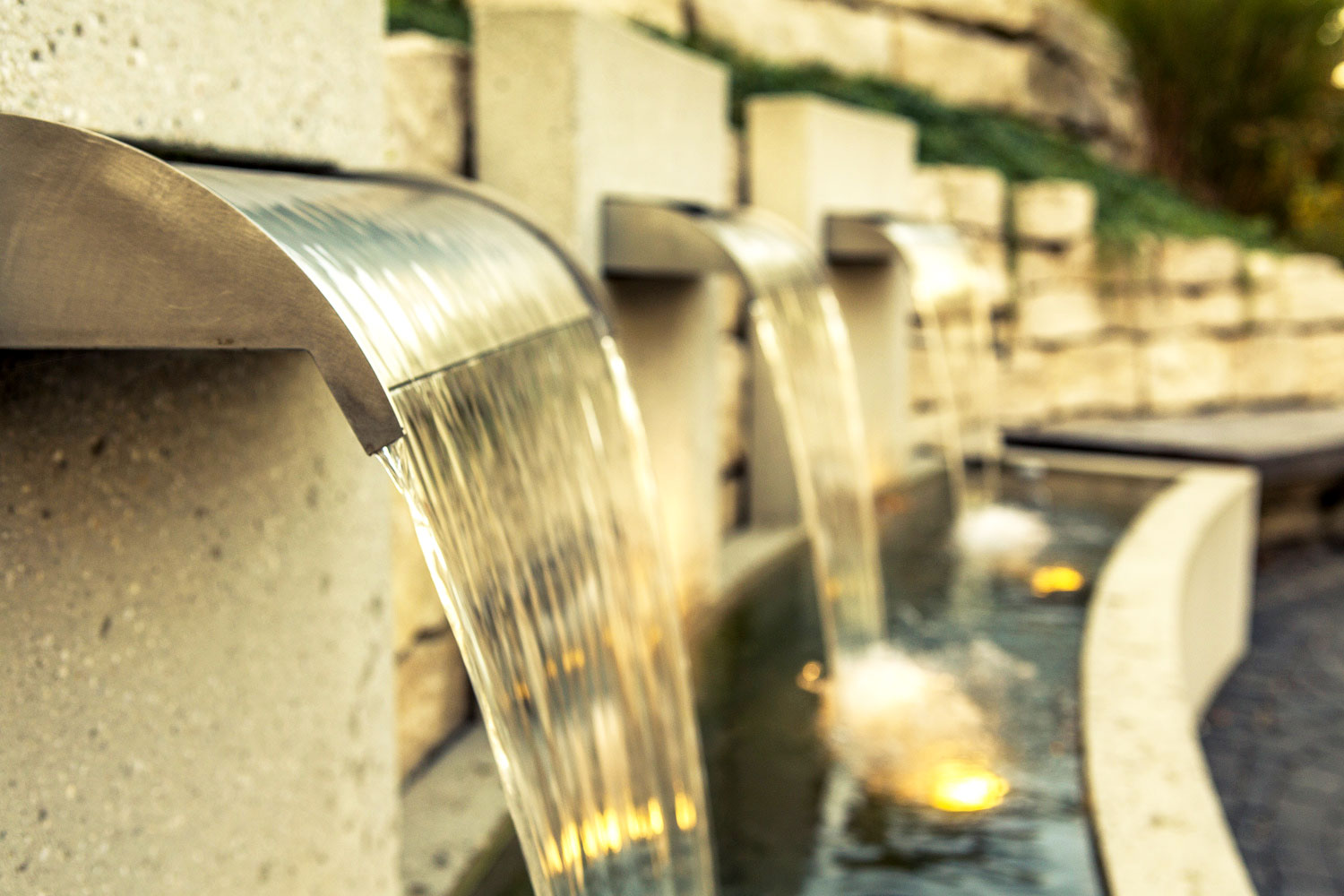 Organisches Wasserbecken aus Beton gegossen, geschwungenes Kalksteinmauerwerk, Pflasterbelag aus Basalt