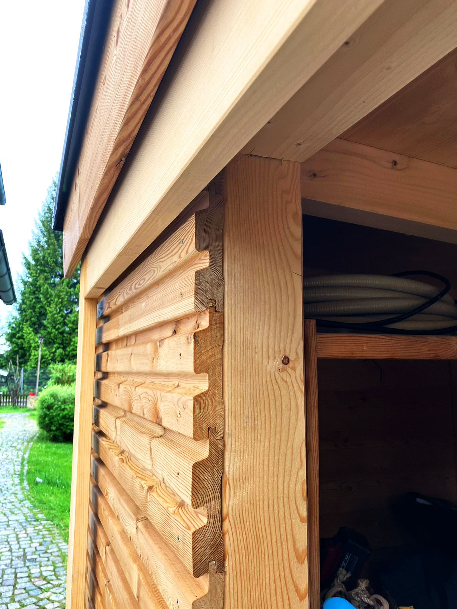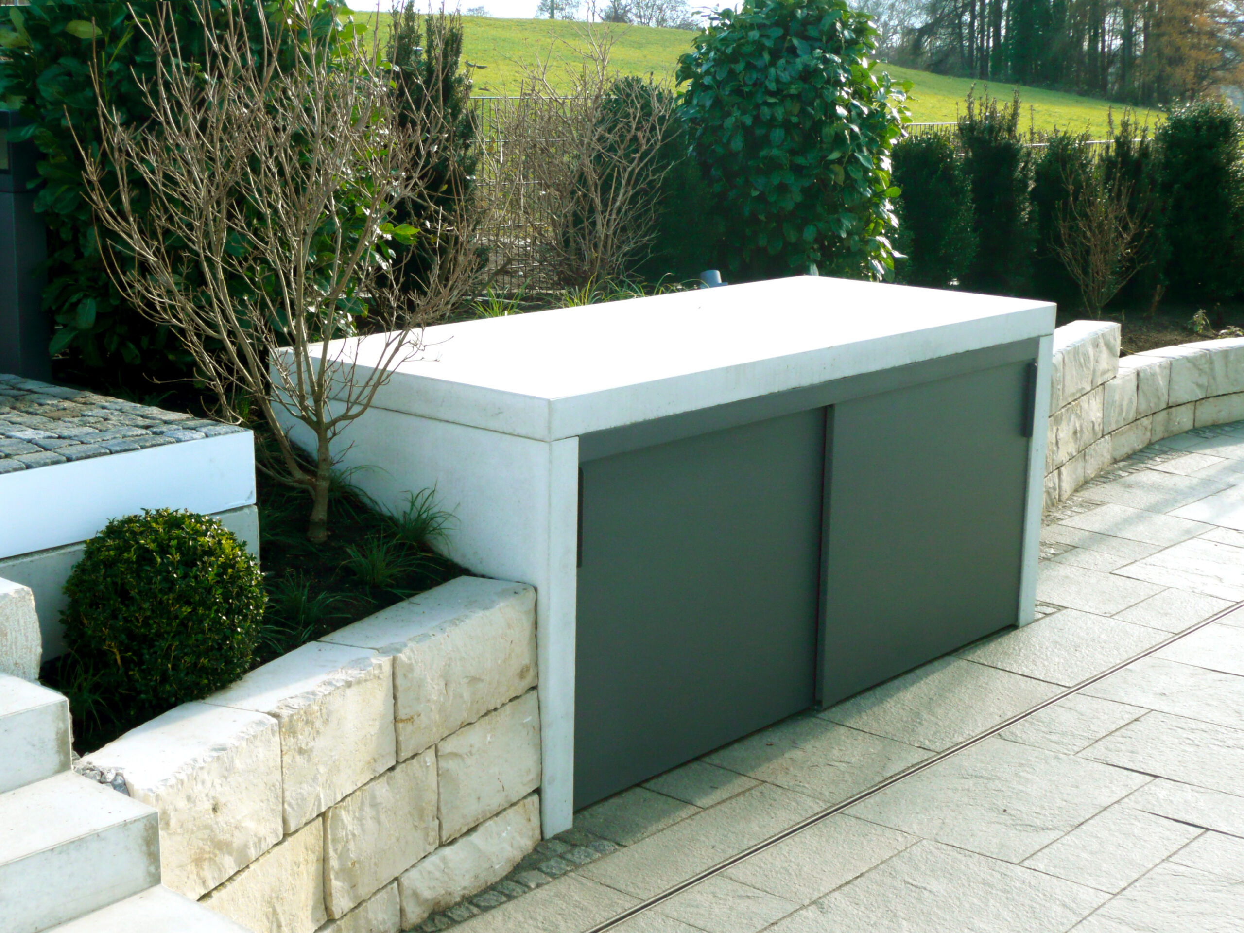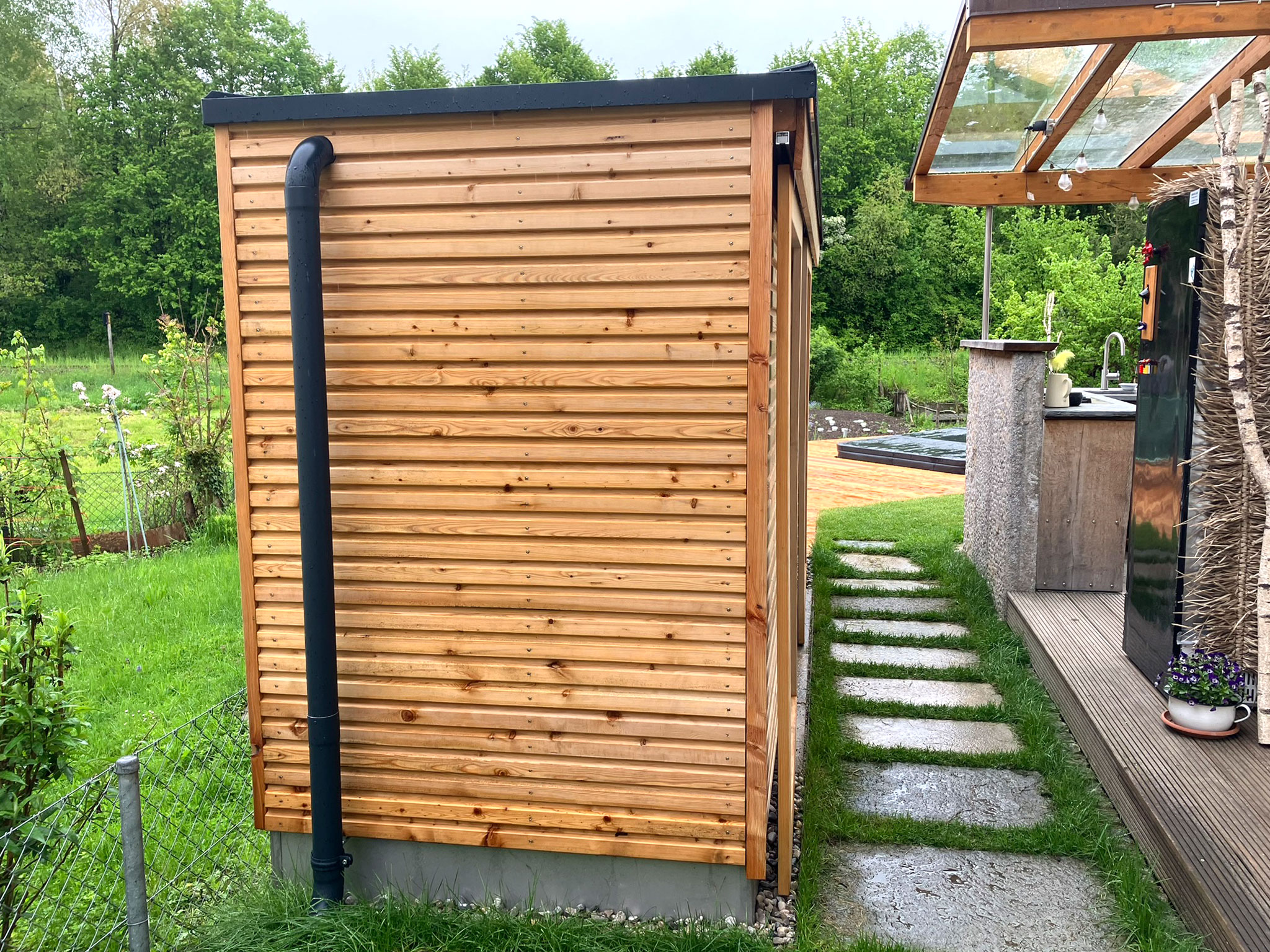 Oft wird eine Nebengebäude oder Gartenschrank als Stauraum für Grill, Gartenliegen, Polster, Gartengeräte, Rasenmäher, Sportgeräte geplant und gebaut. Das hat zwei Funktionen: