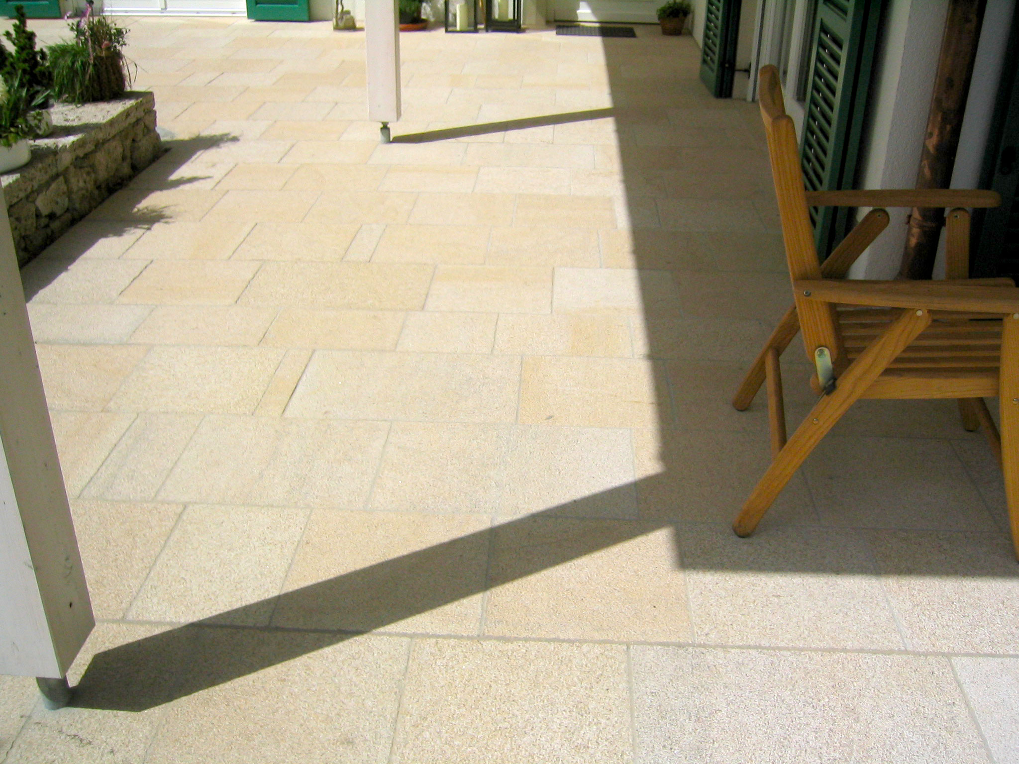 Durch ihre leicht raue Oberfläche sind Sandsteinplatten oft rutschhemmend und damit gut für den Außenbereich geeignet.