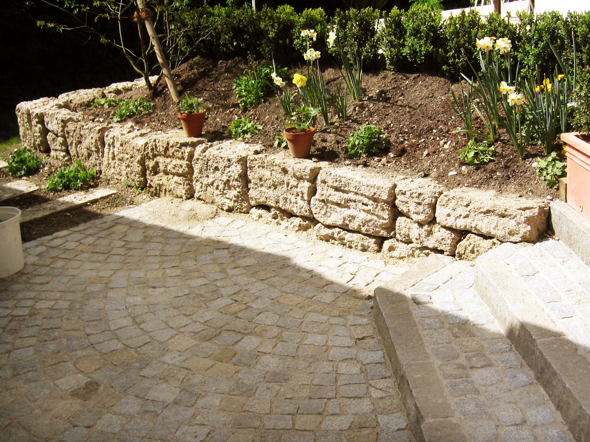 Beim nächsten Bauvorhaben wurde der Terrasenbelag in gebundener Bauweise gefertigt. Beige, feinstrukturierte Graniplatten ergänzen sich prächtig im Gegenspiel zu der Natursteinmauer aus dem heimischen Nagelfluhmauersteien ausd den Steinbrüchen bei Brannenburg. Die Stellstufen sind aus antiken Granitleistensteinen, die Auspflasterung sowie das Pflaster in Segmentbögen ebenfalls aus gebrauchten Granitsteinen.